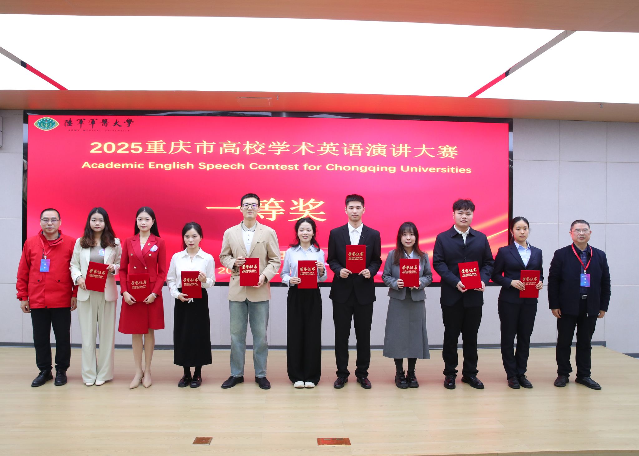 11月16日,2025重庆市高校学术英语演讲大赛决赛在陆军军医大学第二教学馆落下帷幕。我校10个团队入围参赛,荣获一等奖1项、二等奖5项、三等奖4项,学校获评“优秀组织奖”。