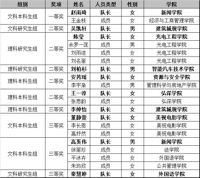 经过初赛、决赛多环节的比拼,我校文科本科生组赵雨琦团队荣获一等奖,文科研究生组吴凯轩、理科本科生组安芮瑶团队、理科本科生组王一淳团队、理科研究生组陈莹团队、理科研究生组刘柏杉获得二等奖,李绰怡团队、董静萱团队、高奚伟团队、秦慧婷团队获得三等奖。