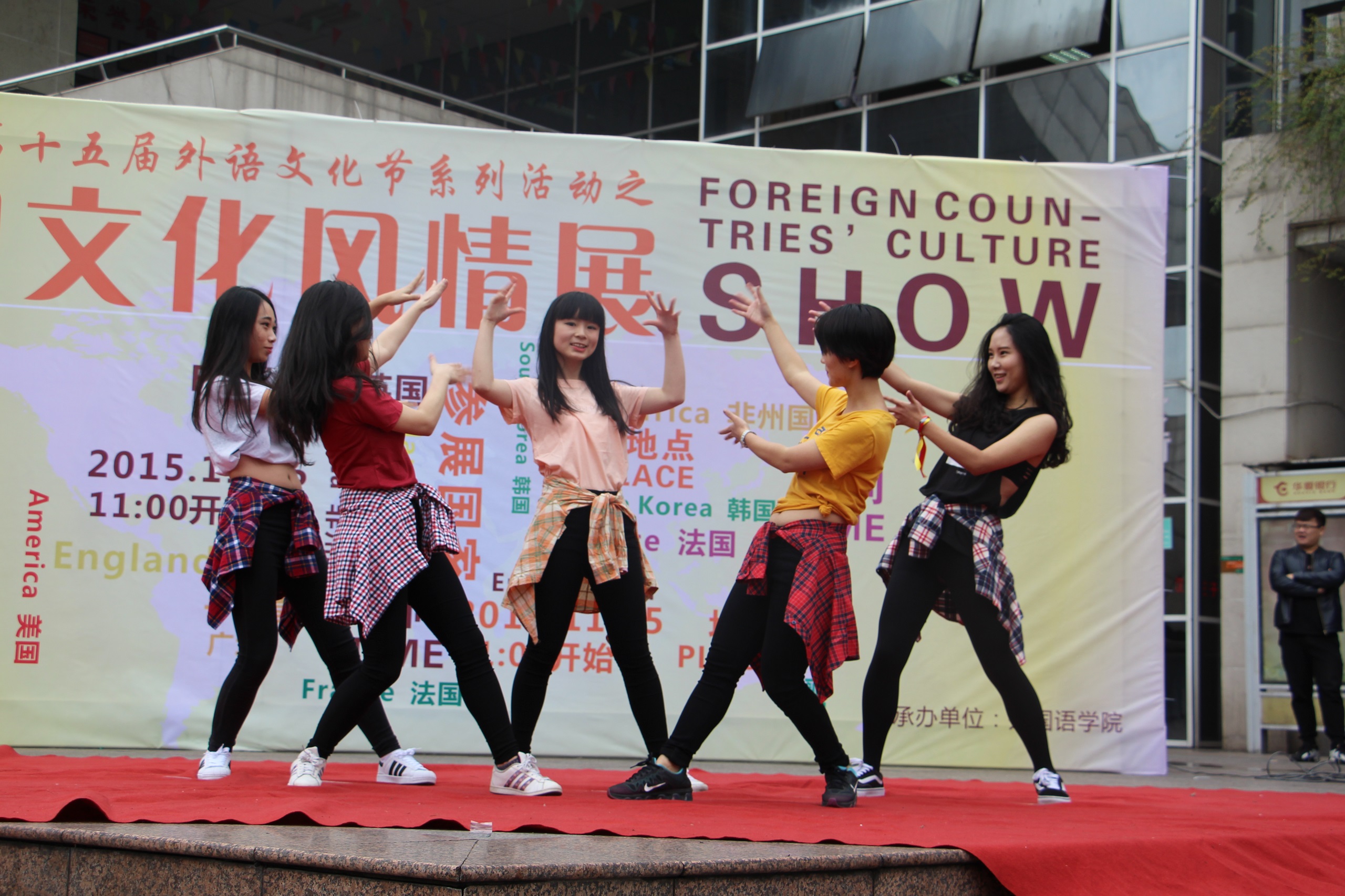 而后一场安静优雅的日本舞再一次吸引住了在场观众的眼球,7位身着日式和服的同学带来了一支优雅的日本舞蹈《夢と葉桜》。接下来的七国时装秀让在场观众大饱眼福,她们分别身穿豹纹猎衣、韩国传统服饰、和服、白雪公主衣裙、芭蕾舞裙、德国足球啦啦队服以及英国宫廷华丽服饰,代表着非洲、韩国、日本、美国、法国、德国及英国等七个国家及地区。随着一曲极富动感的英文歌曲《Blank Space》结束,异国文化风情展的焦点转移到了各个展位之中。