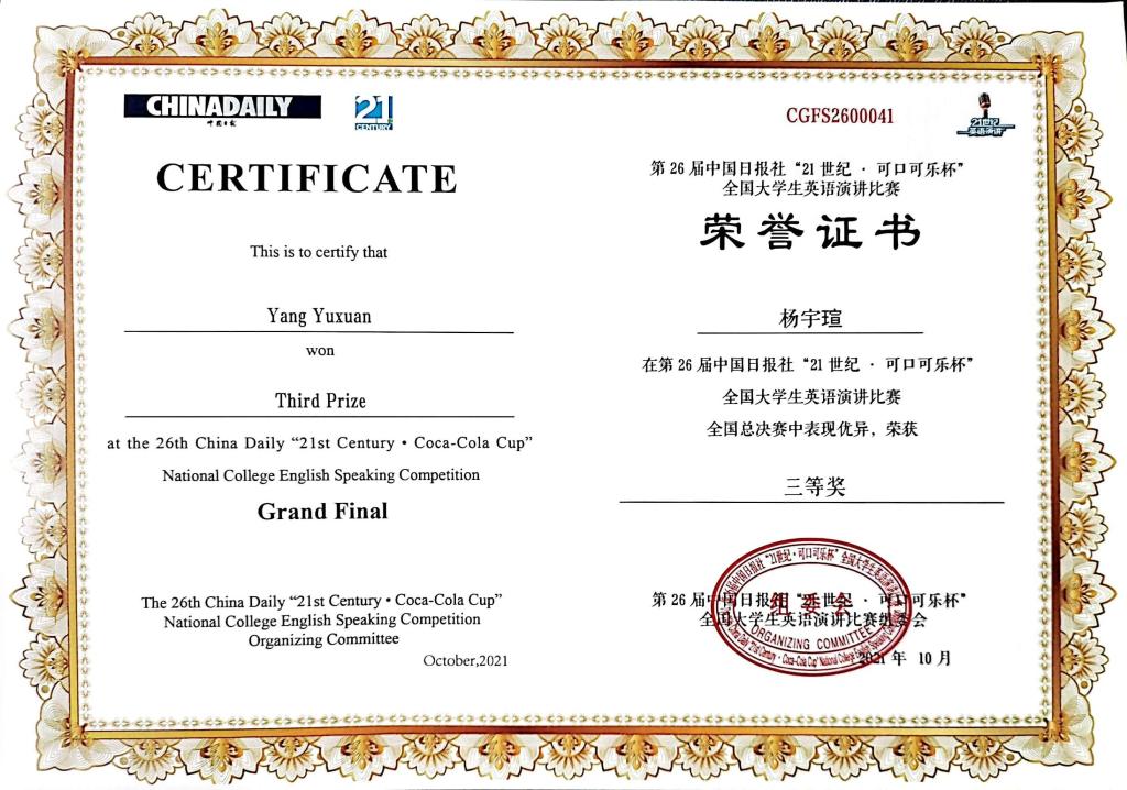 据悉,本次大赛赛题涉及到了建党百年、女性主义、弘扬和传承中华传统文化等多个主题,对选手的知识储备和语言逻辑能力有着很大的考验。我校选手杨宇瑄作为大一学生参加大赛省赛,后入围国赛并在国赛舞台上大放异彩取得可喜成绩,使我校再次在该赛事上赢得国家级奖项。这不仅体现了学生优秀的英语应用综合素质能力,也是我校英语教学水平和第二课堂教学的丰硕效果。