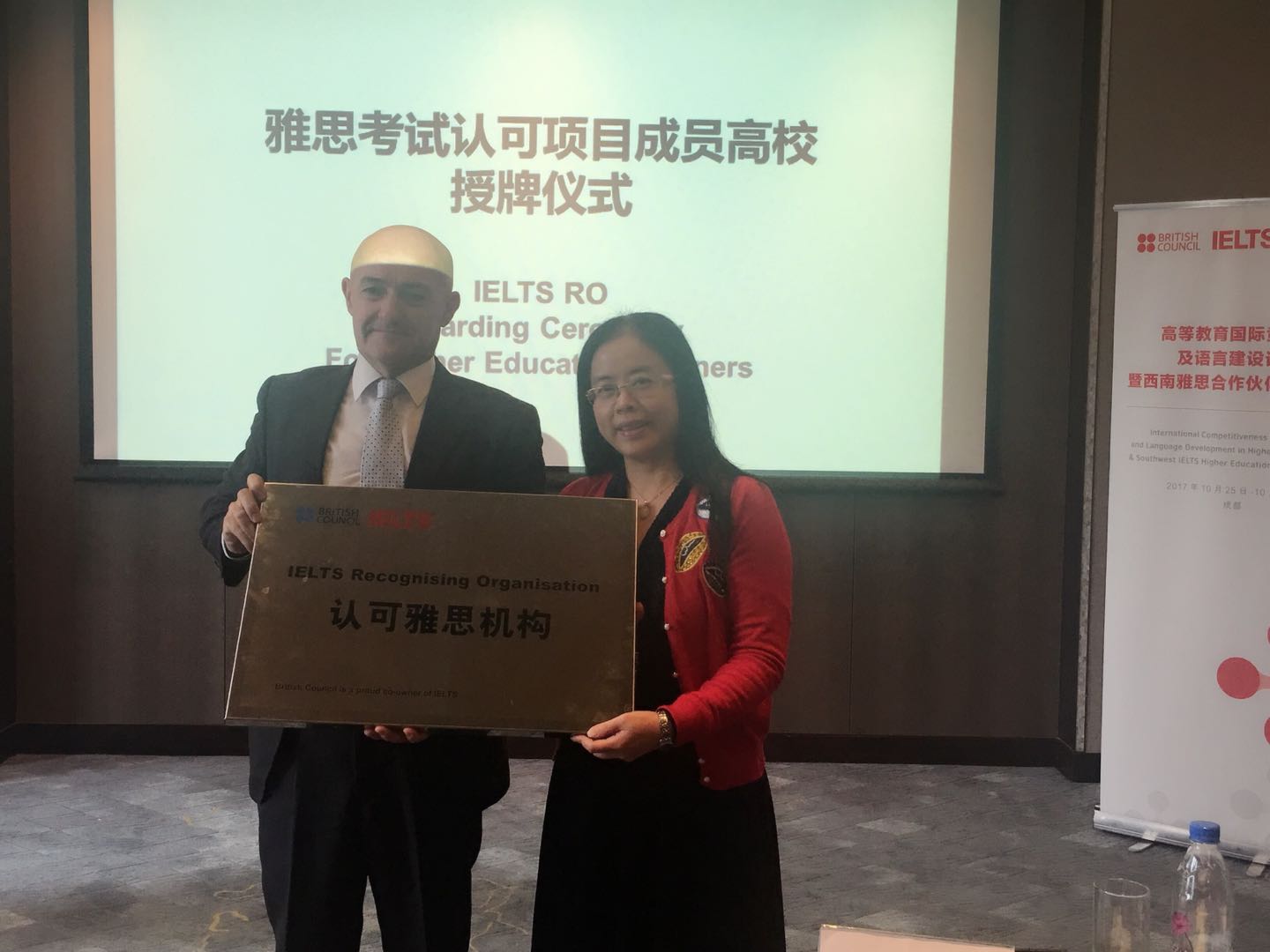 2017年10月25日由英国文化教育协会(雅思考试主办方)举办的“高等教育国际竞争力及语言建设论坛暨西南雅思合作伙伴院校大会”在成都召开,来自西南地区30多所高等院校的80余名领导和教师共同参加了本次会议。会议分享了高校国际化探索经验,以及引入雅思、普思考试对高校英语语言建设所产生的积极影响。会议席间,英国文化教育协会为漫蛙
