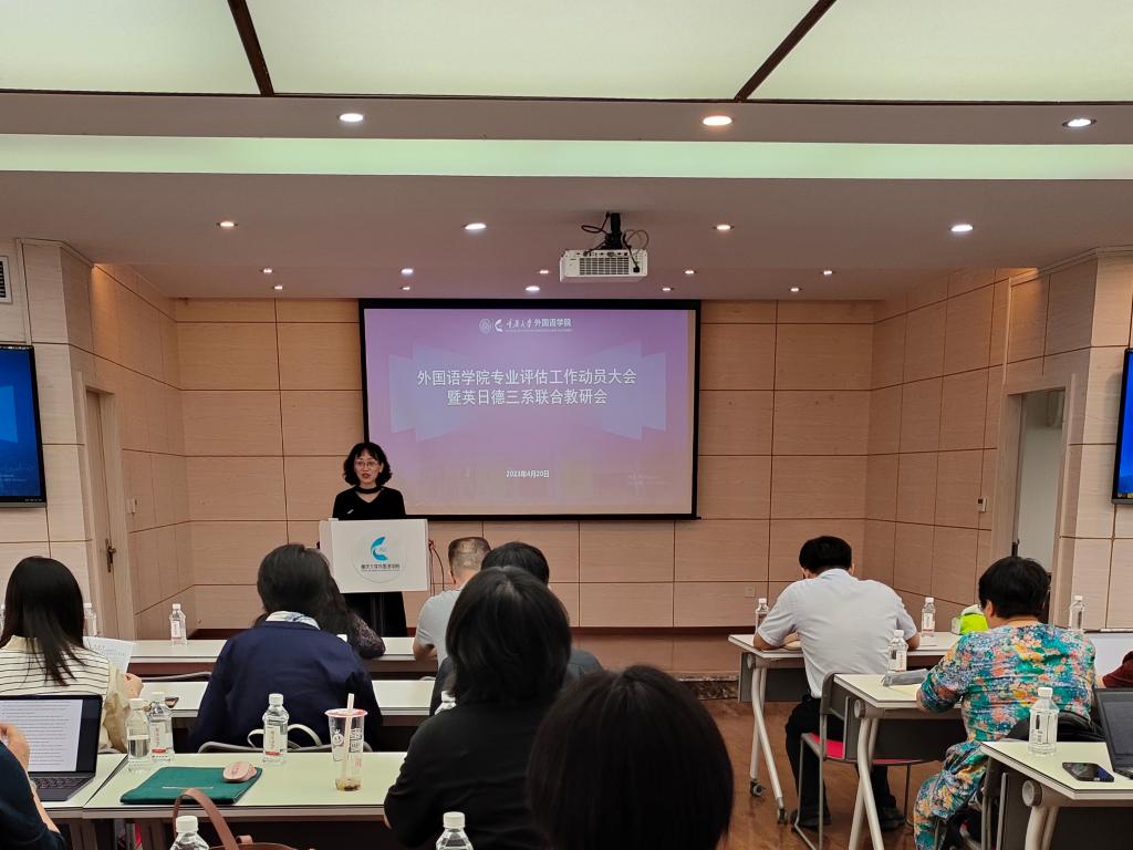 王江副院长主持了英日德教研会相关议题的探讨。首先是教务办老师和专业评估小组与在场老师们进行互动答疑。接下来,英日德三系对近期毕业论文的过程指导和质量保障等进行了探讨,一致认为要大力敦促毕业学生更加重视论文撰写,也要加大力度加强论文撰写的学术指导。在会上,还就漫蛙