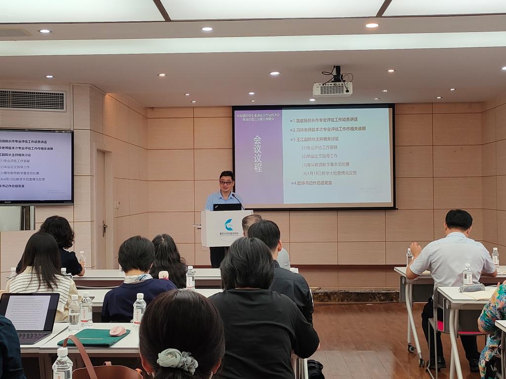 教务办公室冯玲老师介绍了本科专业评估的流程、细则、工作原则,评价指标,并特别强调了评估工作各个阶段的时间截点。