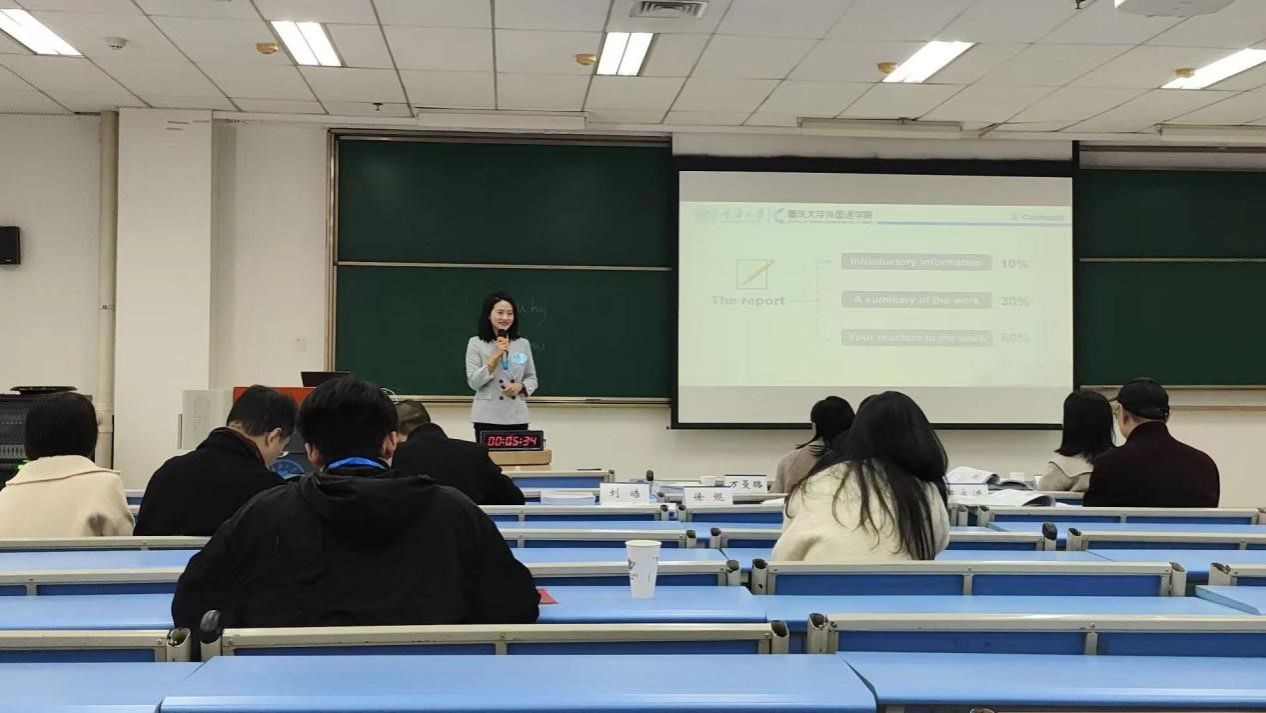 郑尧老师以《英语思辨与写作(1)》课程中的读书报告的写作为题,讲解了英文读书报告的重要性以及写作技巧,生动呈现了读书报告的语步,并通过启发式教学与案例分析解析了读书报告的语言特点。姚倩老师以《普通话与中国的语保工程》为题,从“生态”出发,引出“语言濒危”的现实问题,并通过精彩的讲解让听众深入了解了这一主题。姚老师指出普通话推广成功的同时,方言消失成为不可忽视的问题。两位老师的教学展示目标明确、逻辑清晰、语言流畅、内容丰富,受到了专家们的一致好评。