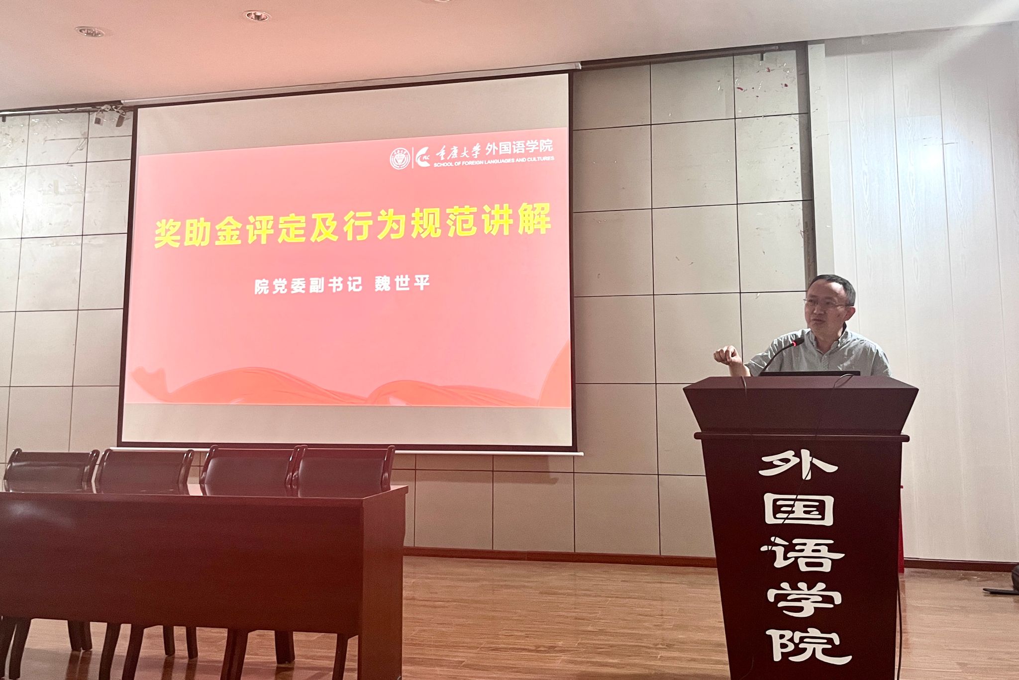 党委副书记魏世平对奖助金评定及行为规范进行解读,他希望同学们能够慎独自律,矢志不渝地追求心中理想。同时尽快适应研究生学习生活的节奏,提升安全防范意识,有效规避危险。