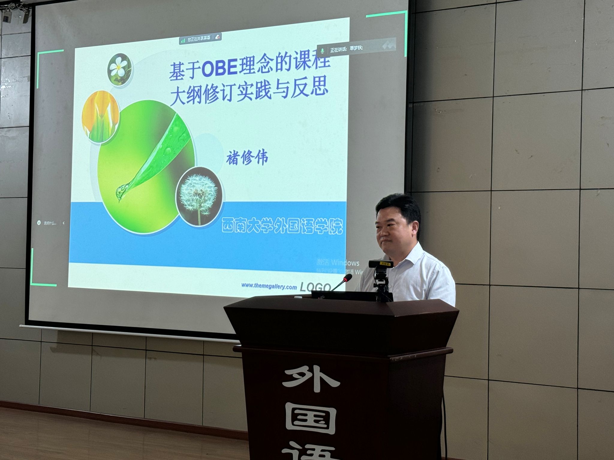 紧接着,西南大学褚修伟教授以“基于OBE理念的课程大纲修订实践与反思”为题进行了深入的讲解。褚教授首先介绍了OBE(Outcome-Based Education)这一核心理念,以及教学大纲修订的原则,并从课程目标、教学内容、教学方法与手段、课程考核与课程目标达成情况分析等角度出发详细阐述了教学大纲的撰写方法和注意事项。