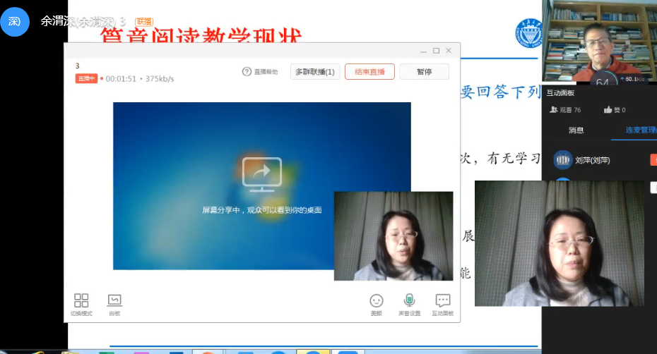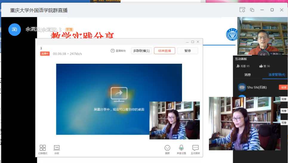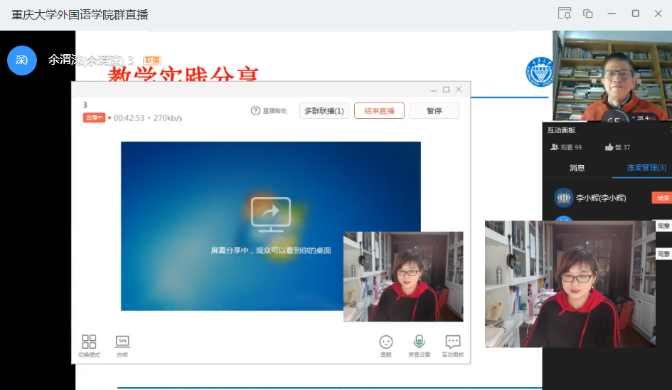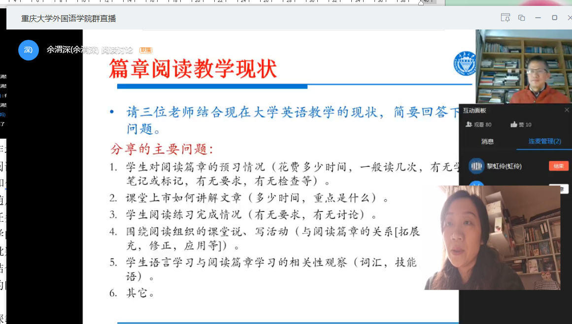 资深教授余渭深老师于2020年4月2日依托钉钉平台举办了名为“大学英语教材文本阅读深度教学法的思考”的教学及研究工作坊。来自本院和重庆市其他高校100多大学英语教师参加了此次线上研讨。在此次工作坊中,余渭深教授引导与会老师从文本阐释者、技能学习者、文本使用者的视角来思考自身在阅读教学设计与实践中的收获与存在的问题。