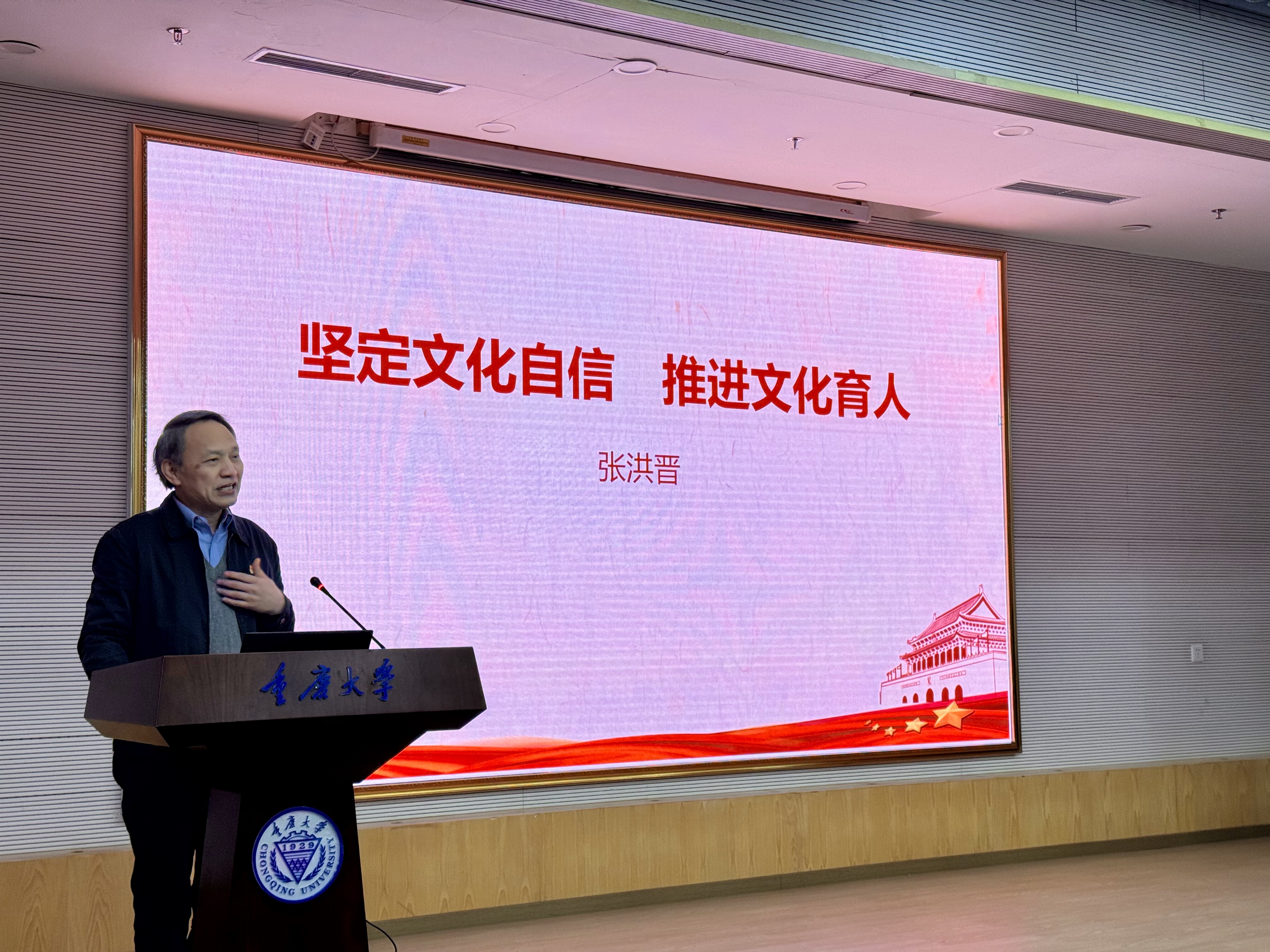 随后,重庆市委党校张洪晋教授作了题为“坚定文化自信,推进文化育人”的主旨发言。张教授在发言中深刻分析了当前国际形势下坚定文化自信的重要性,并提出了推进文化育人的具体措施。张校长首先指出在世界百年未有之大变局加速演进的大背景下,我国思政教育和文化自信面临着亚文化兴起、意识形态安全形势严峻等多重挑战。张教授强调思政教育要紧紧围绕培养什么人、怎样培养人、为谁培养人这一核心命题,切实抓好文化素质教育。张教授提出了文化育人的具体措施:需要大力弘扬中华优秀传统文化、坚持中华文化主体性、坚持守正创新,勇担文化使命。以坚定的文化自信,推进以文化人、以文育人,切实担负好立德树人的时代重任。张教授的发言引起了与会学者的广泛认同和积极响应。