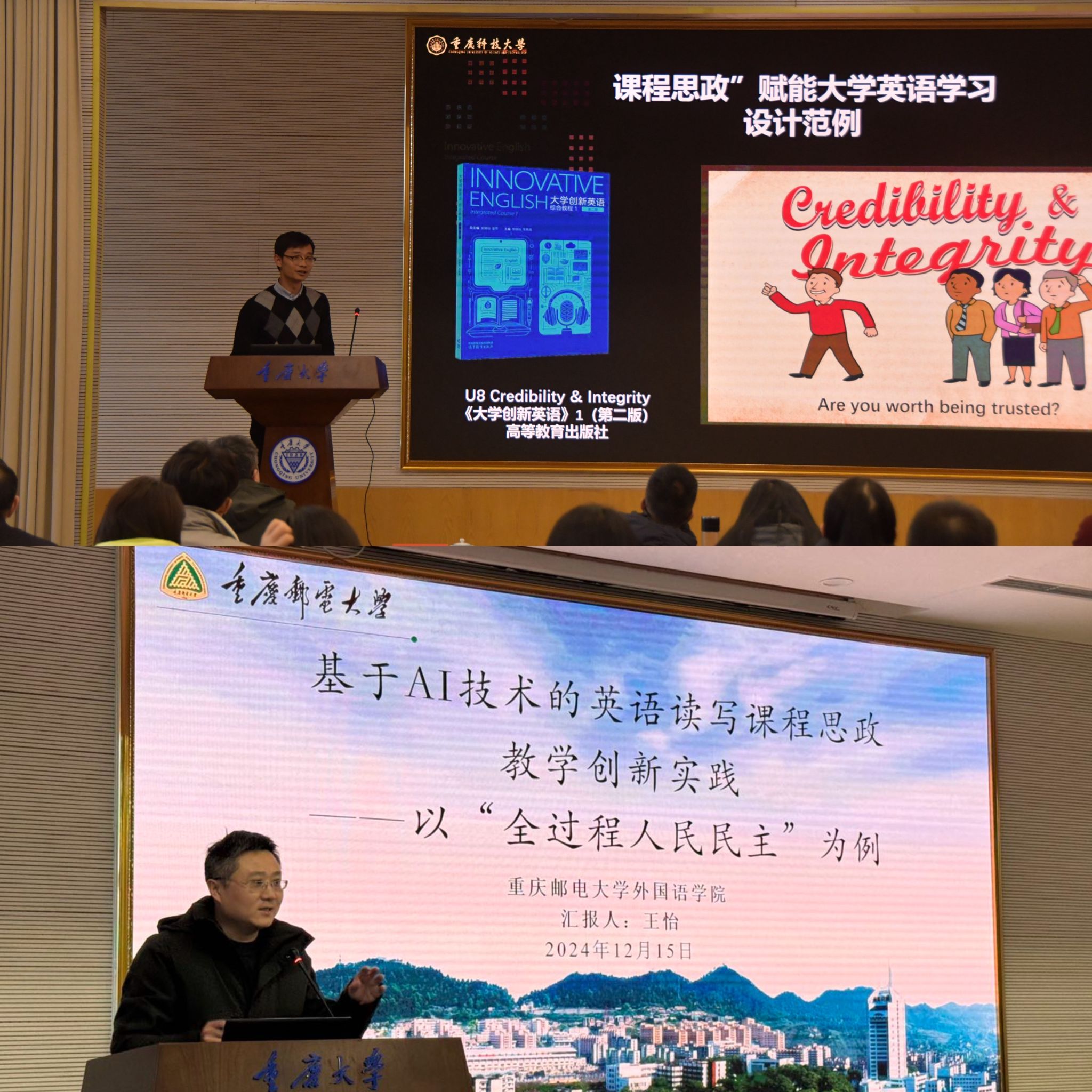 在课程思政案例分享环节,重庆科技大学的肖隽逸老师分享了“道不远人,人皆可以为尧舜”的案例,探讨了如何用“课程思政”赋能大学英语教学。这一案例通过“Credibility & Integrity”单元设计,挖掘语言学习与思想政治教育的契合点,培养学生的自我修养和社会责任感。同时,重庆邮电大学的王怡教授介绍了基于AI技术的英语读写课程思政教学创新,以“全过程人民民主”为例,通过多模态学习路径和项目式学习法,从语言、知识、技能三方面提升学生的自主学习能力和跨文化表达能力,强化对中国特色社会主义政治制度的认同。