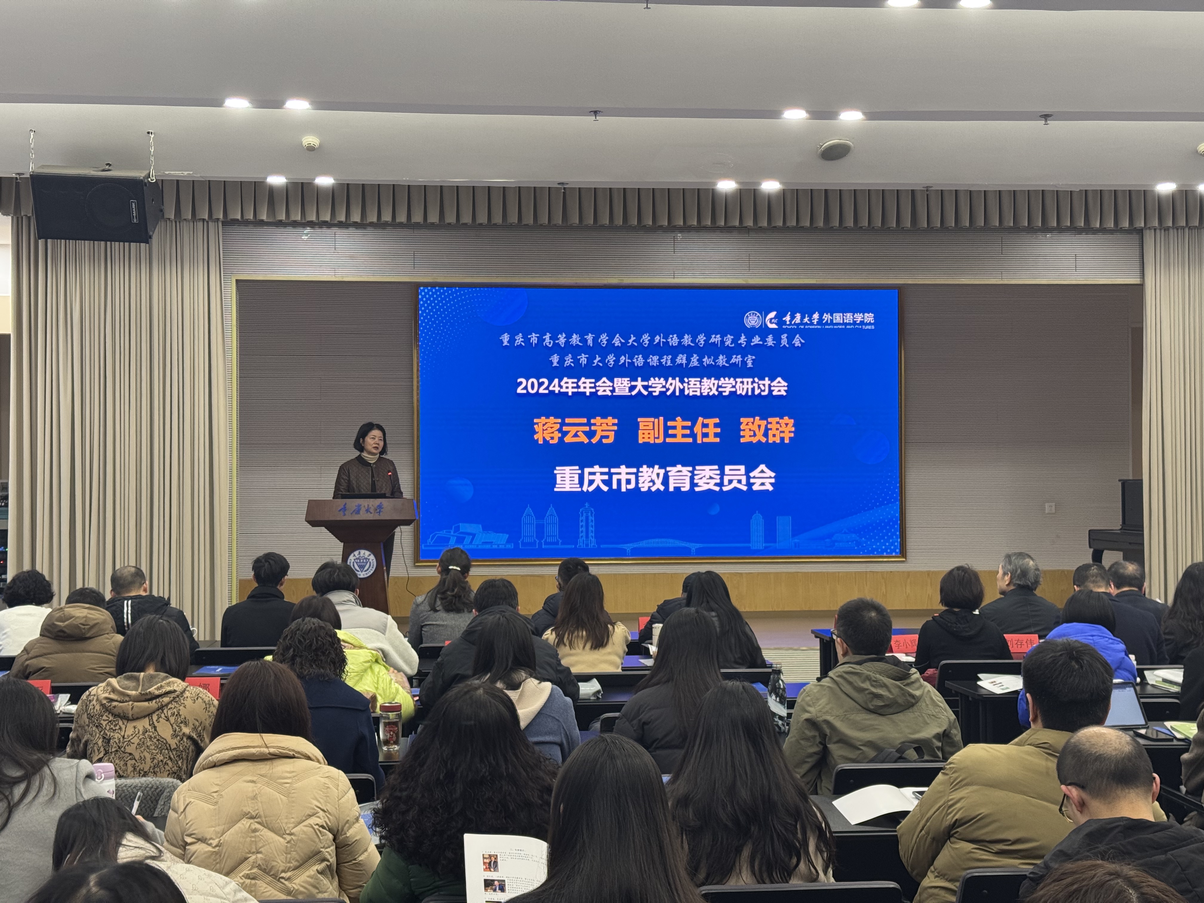 承办。重庆市教育委员会蒋云芳副主任、重庆市高等教育学会余志祥秘书长、重庆市高等教育学会大学外语教学研究专委会理事长余渭深教授以及来自全重庆市各高校的副理事长、理事及教师代表110余人参加了本次会议。开幕式由大学外语教学研究专委会常务副理事长、漫蛙